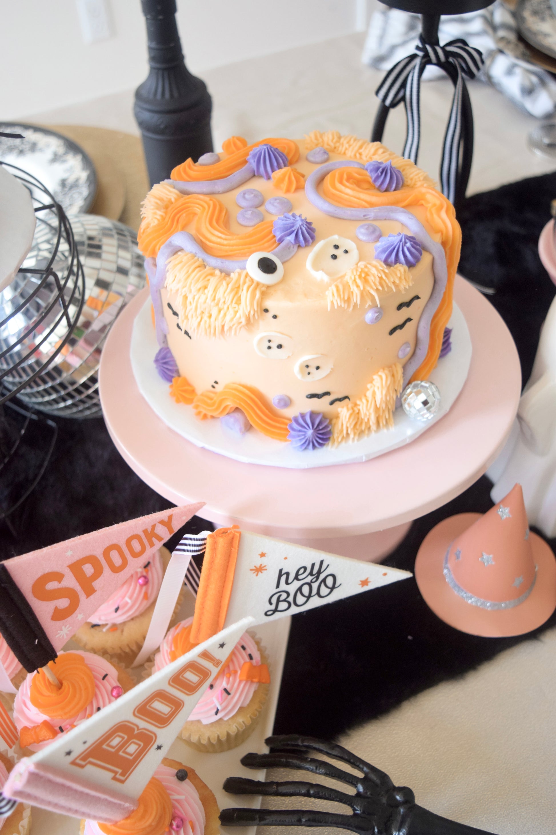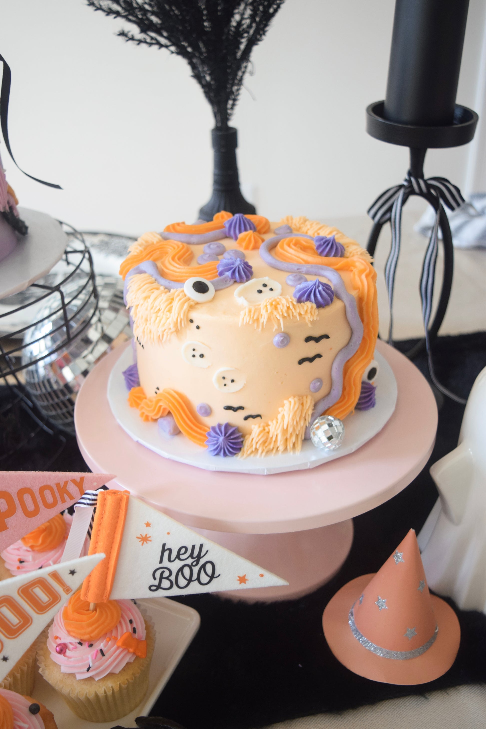 The Ghoul Party cake is full of fun and funk! With whimsy buttercream swirls and whirls, the Halloween characters on this cake are having a true *Ghoul Party*