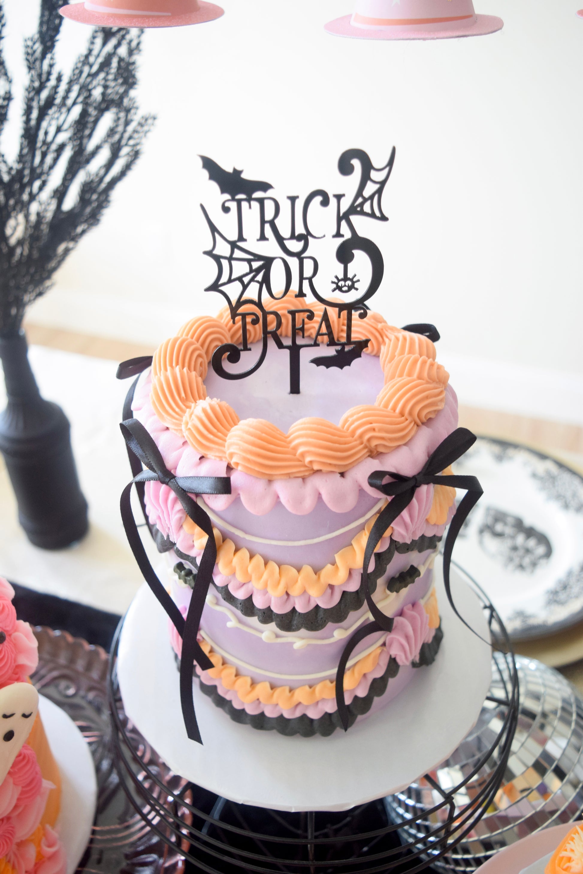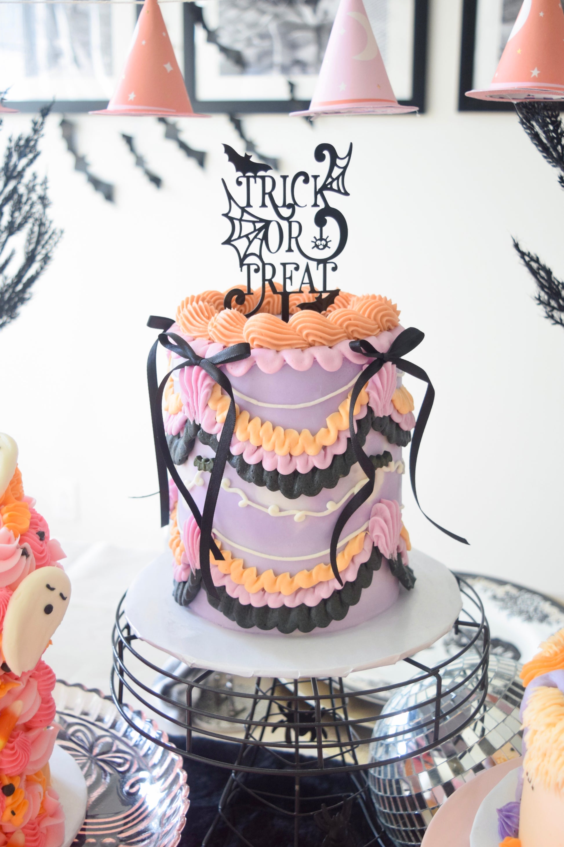 The Witch's Brew cake is a spooky Halloween delight! Frosted with elegant drapes, classic Halloween colors, and bows dangling around the sides, this cake makes for a festive fright!